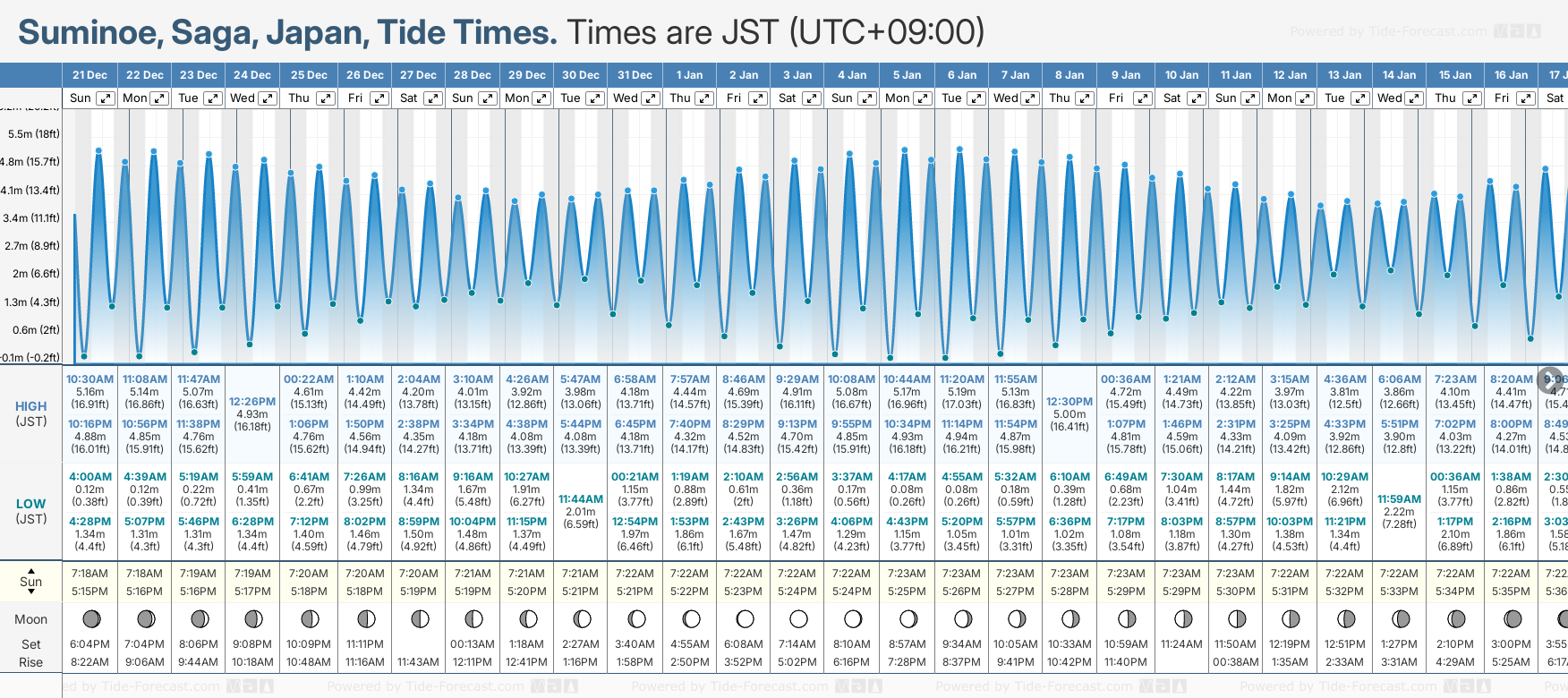 Tide Times are JST (UTC +9.0hrs). Last Spring High Tide at Suminoe was on Sat 06 Dec (height: 5.24m 17.2ft). Next high Spring Tide at Suminoe will be on Tue 06 Jan (height: 5.19m 17.0ft).