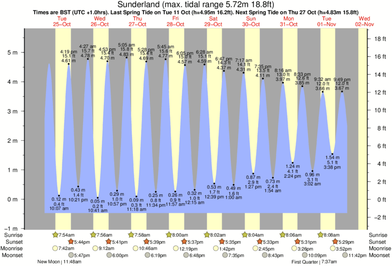 Tide Times are GMT (UTC +0hrs). Last Spring High Tide at Sunderland was on Sat 06 Dec (height: 4.85m 15.9ft). Next high Spring Tide at Sunderland will be on Mon 22 Dec (height: 4.32m 14.2ft).