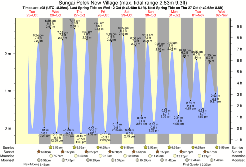 Tide Times are +08 (UTC +8.0hrs). Last Spring High Tide at Sungai Pelek New Village was on Thu 04 Dec (height: 2.68m 8.8ft). Next high Spring Tide at Sungai Pelek New Village will be on Mon 22 Dec (height: 2.48m 8.1ft).