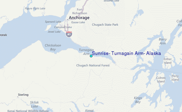 Use this relief map to navigate to tide stations, surf breaks and cities that are in the area of Sunrise, Turnagain Arm, Alaska.