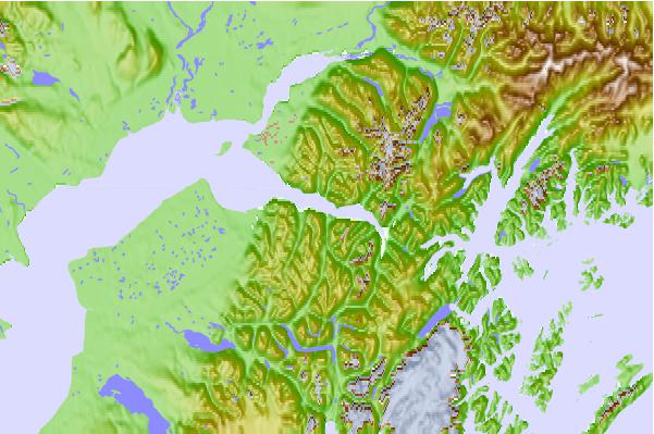 Use this relief map to navigate to tide stations, surf breaks and cities that are in the area of Sunrise, Turnagain Arm #11, Alaska.