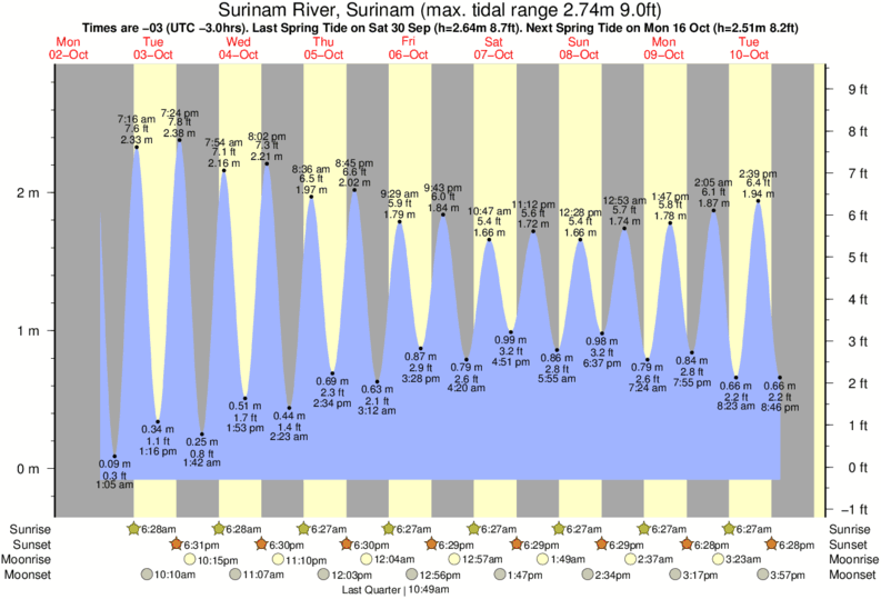 Tide chart for Surinam River, SurinamShowing low and high tide times for the next 30 days at Surinam River, Surinam. Tide Times are -03 (UTC -3.0hrs).