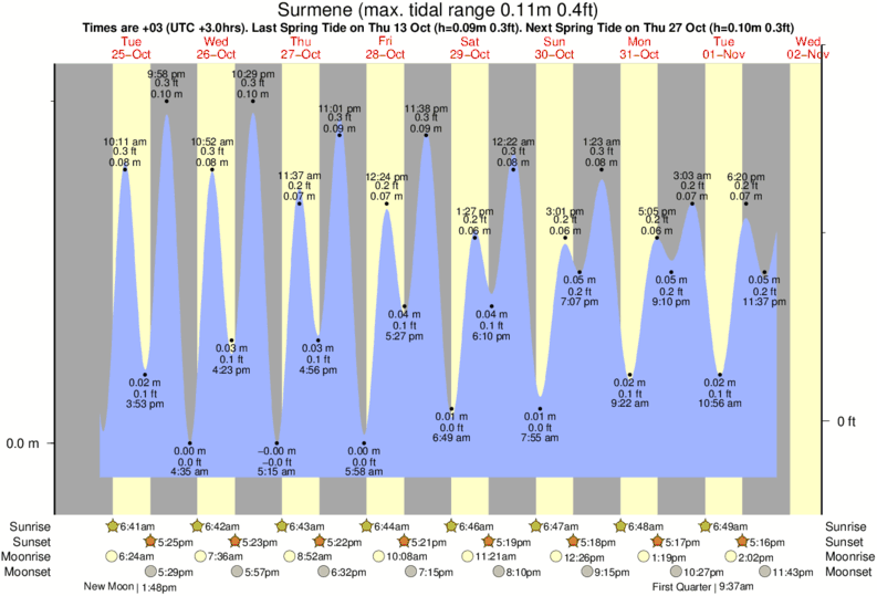 Tide Times are +03 (UTC +3.0hrs). Last Spring High Tide at Surmene was on Sat 20 Dec (height: 0.09m 0.3ft). Next high Spring Tide at Surmene will be on Thu 01 Jan (height: 0.10m 0.3ft).