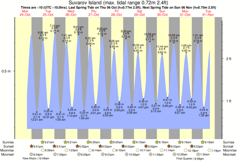 Tide Times are -10 (UTC -10.0hrs). Last Spring High Tide at Suvarov Island was on Fri 19 Dec (height: 0.70m 2.3ft). Next high Spring Tide at Suvarov Island will be on Fri 02 Jan (height: 0.80m 2.6ft).