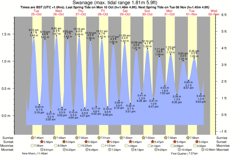 Swanage tide chart key: The tide chart above shows the height and times of high tide and low tide for Swanage. The grey shading corresponds to nighttime hours between sunset and sunrise at Swanage.