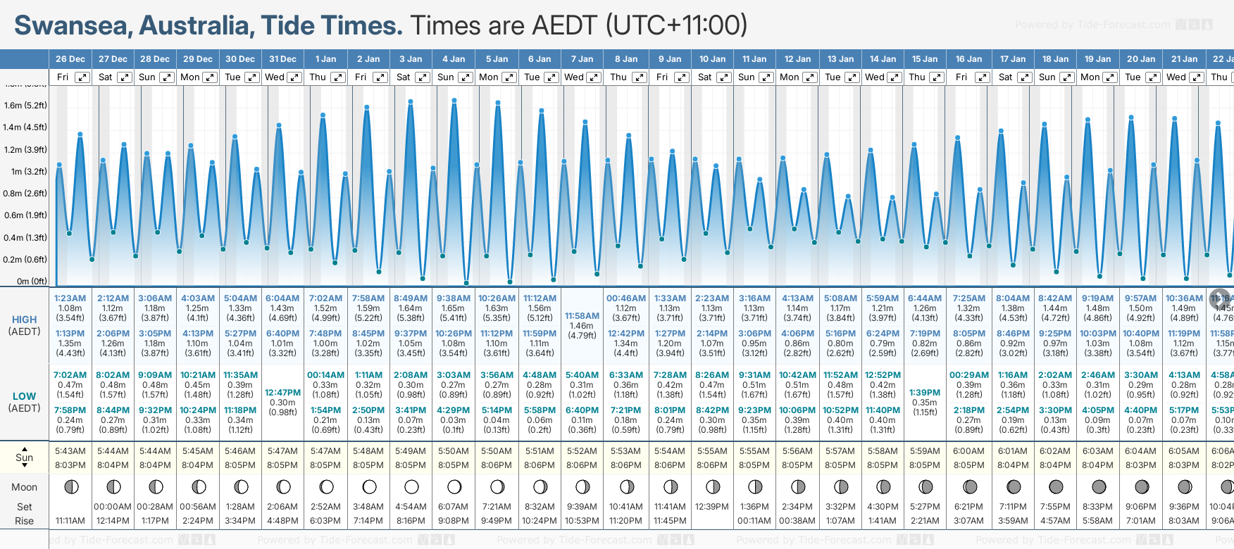 Tide Times are AEDT (UTC +11.0hrs). Last Spring High Tide at Swansea was on Mon 22 Dec (height: 1.50m 4.9ft). Next high Spring Tide at Swansea will be on Sun 04 Jan (height: 1.65m 5.4ft).