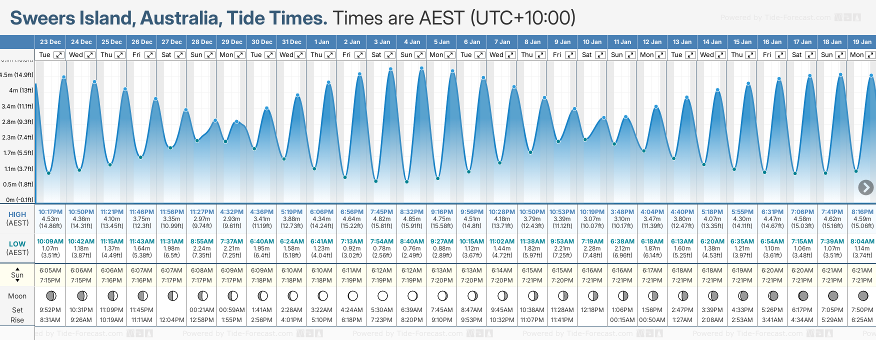December and January Tide charts for Sweers Island: The tide charts below show the height, time and date of high and low tides for the next 30 days.