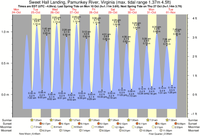 Tide chart for Sweet Hall Landing, Pamunkey RiverShowing low and high tide times for the next 30 days at Sweet Hall Landing, Pamunkey River. Tide Times are EST (UTC -5.0hrs).