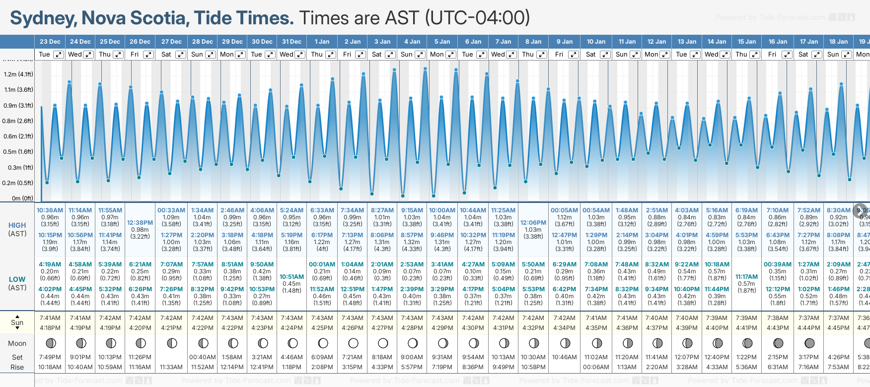 Tide chart for SydneyShowing low and high tide times for the next 30 days at Sydney. Tide Times are AST (UTC -4.0hrs).