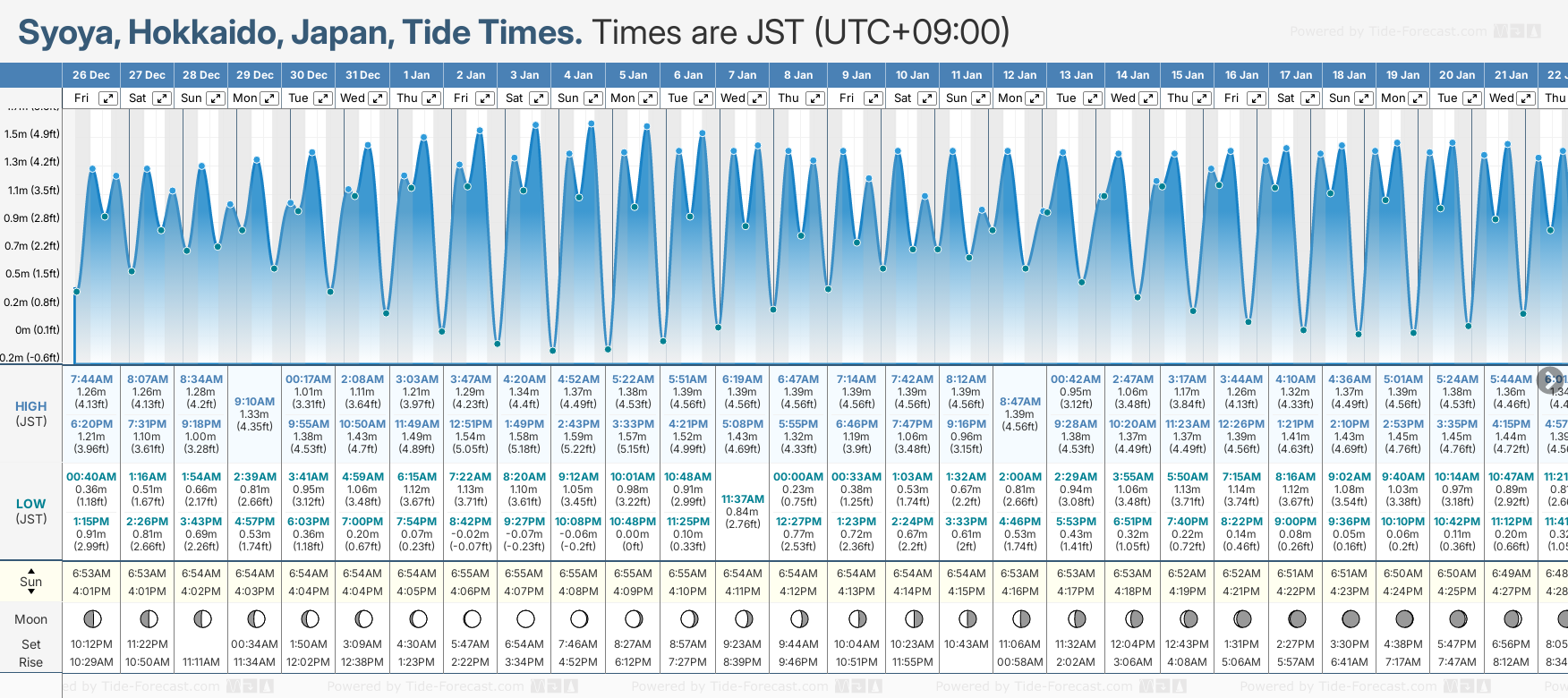 December and January Tide charts for Syoya: The tide charts below show the height, time and date of high and low tides for the next 30 days.