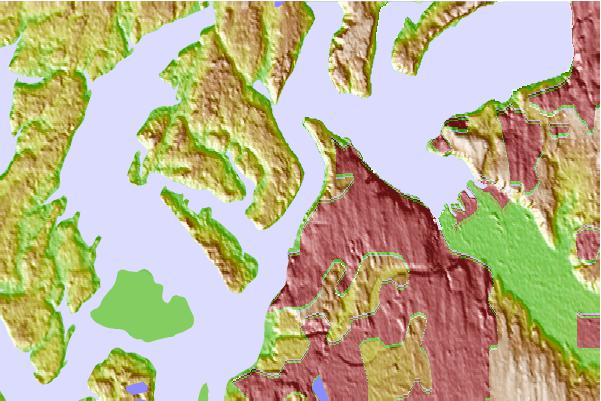 Use this relief map to navigate to tide stations, surf breaks and cities that are in the area of Tacoma Narrows Bridge, Washington.