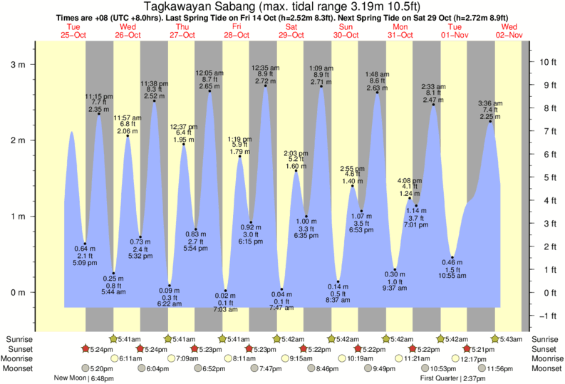 Tide Times are PST (UTC +8.0hrs). Last Spring High Tide at Tagkawayan Sabang was on Sun 07 Dec (height: 2.98m 9.8ft). Next high Spring Tide at Tagkawayan Sabang will be on Tue 23 Dec (height: 2.66m 8.7ft).