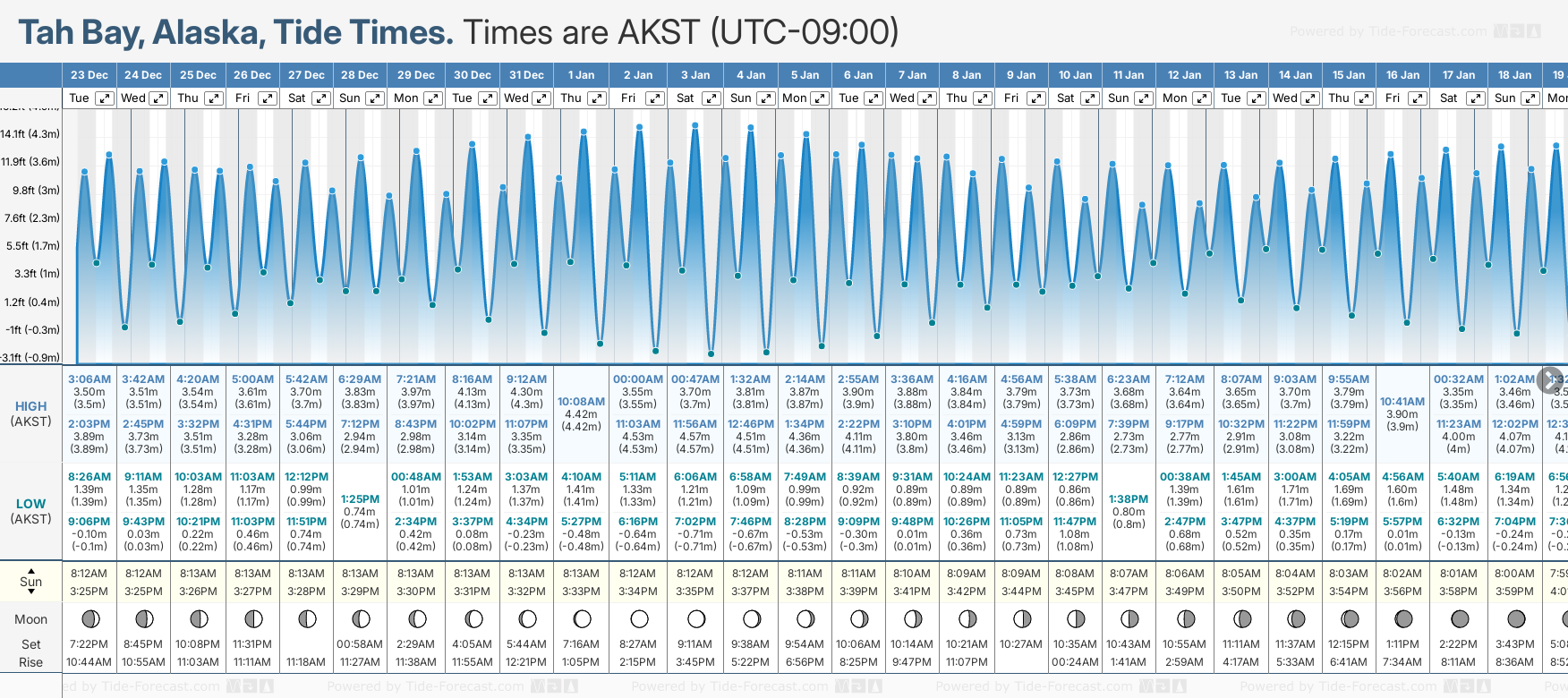 December and January Tide charts for Tah Bay: The tide charts below show the height, time and date of high and low tides for the next 30 days.