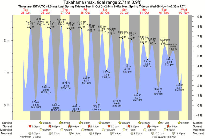 Tide Times are JST (UTC +9.0hrs). Last Spring High Tide at Takahama was on Fri 05 Dec (height: 2.44m 8.0ft). Next high Spring Tide at Takahama will be on Sun 21 Dec (height: 2.20m 7.2ft).