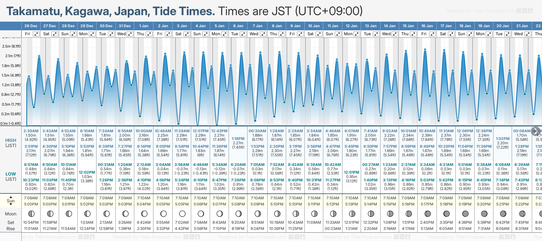 December and January Tide charts for Takamatu: The tide charts below show the height, time and date of high and low tides for the next 30 days.