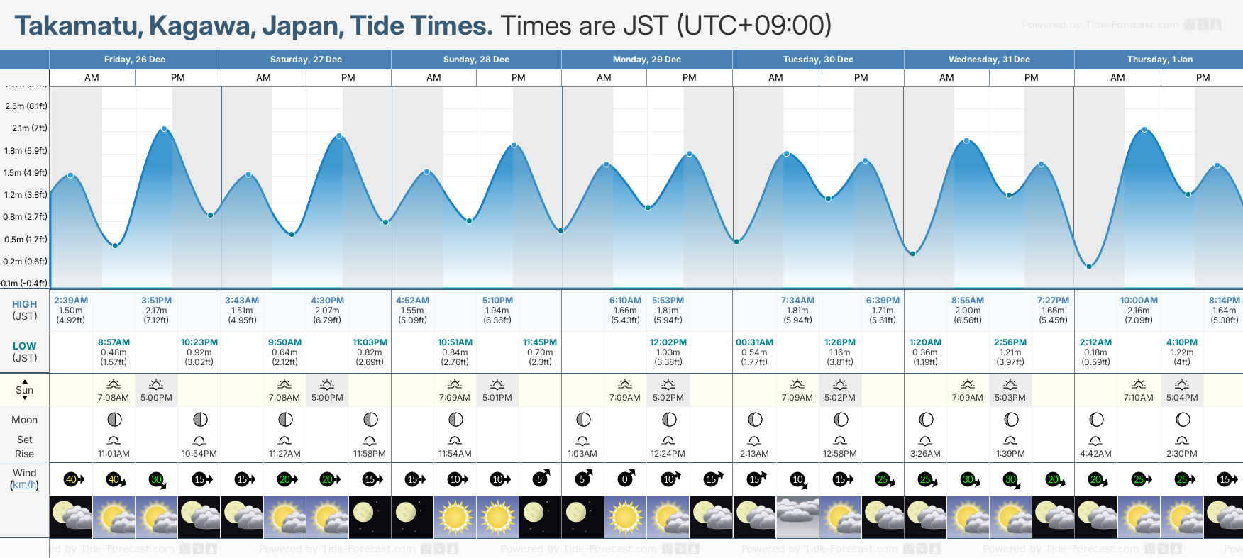 Tide Times are JST (UTC +9.0hrs). Last Spring High Tide at Takamatu was on Thu 18 Dec (height: 2.46m 8.1ft). Next high Spring Tide at Takamatu will be on Sat 03 Jan (height: 2.29m 7.5ft).
