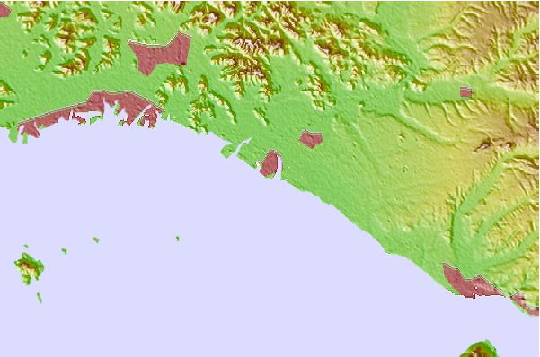 Use this relief map to navigate to tide stations, surf breaks and cities that are in the area of Takasago, Hyogo, Japan.