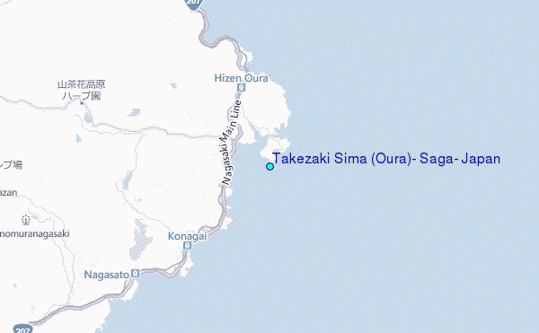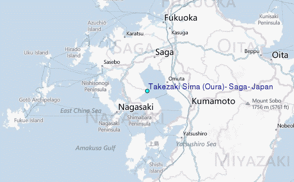 Use this relief map to navigate to tide stations, surf breaks and cities that are in the area of Takezaki Sima (Oura), Saga, Japan.