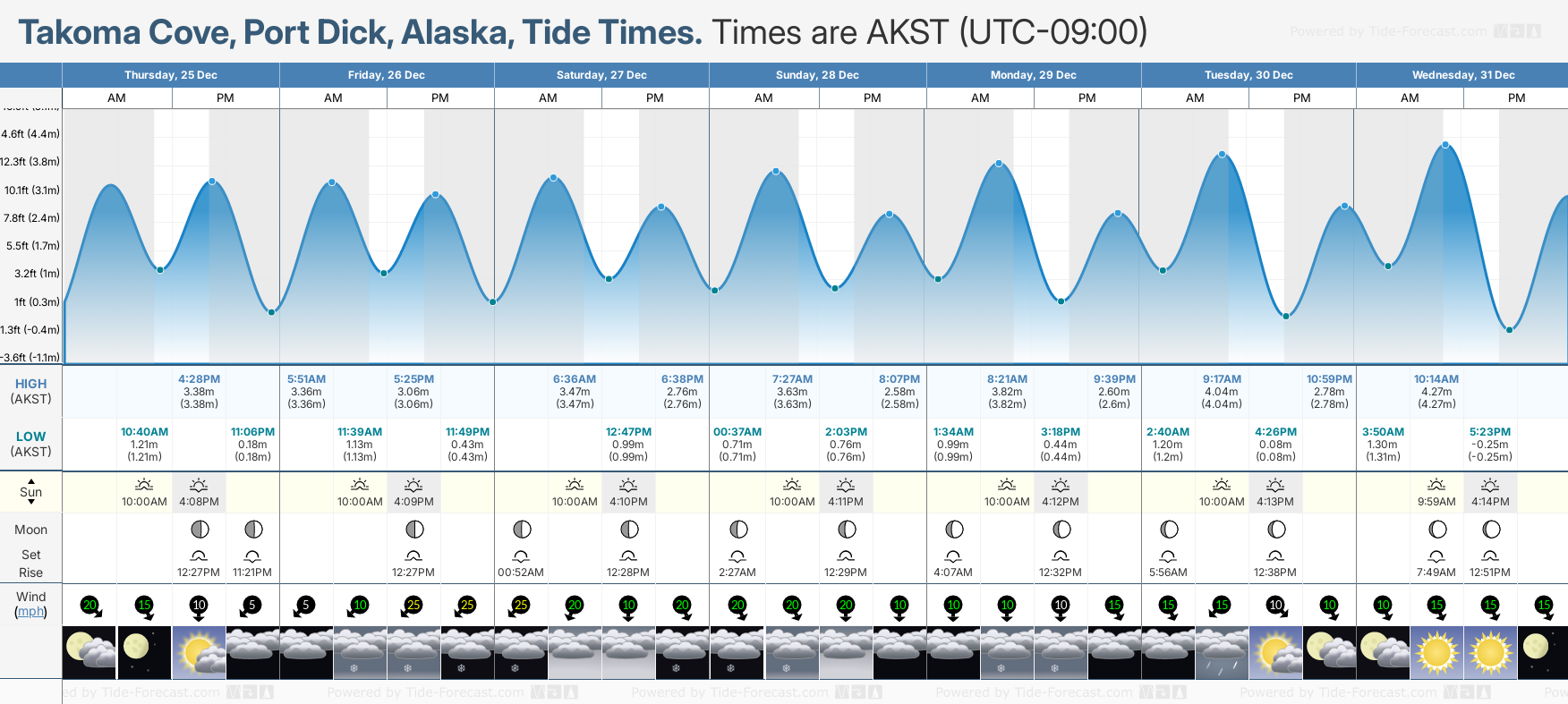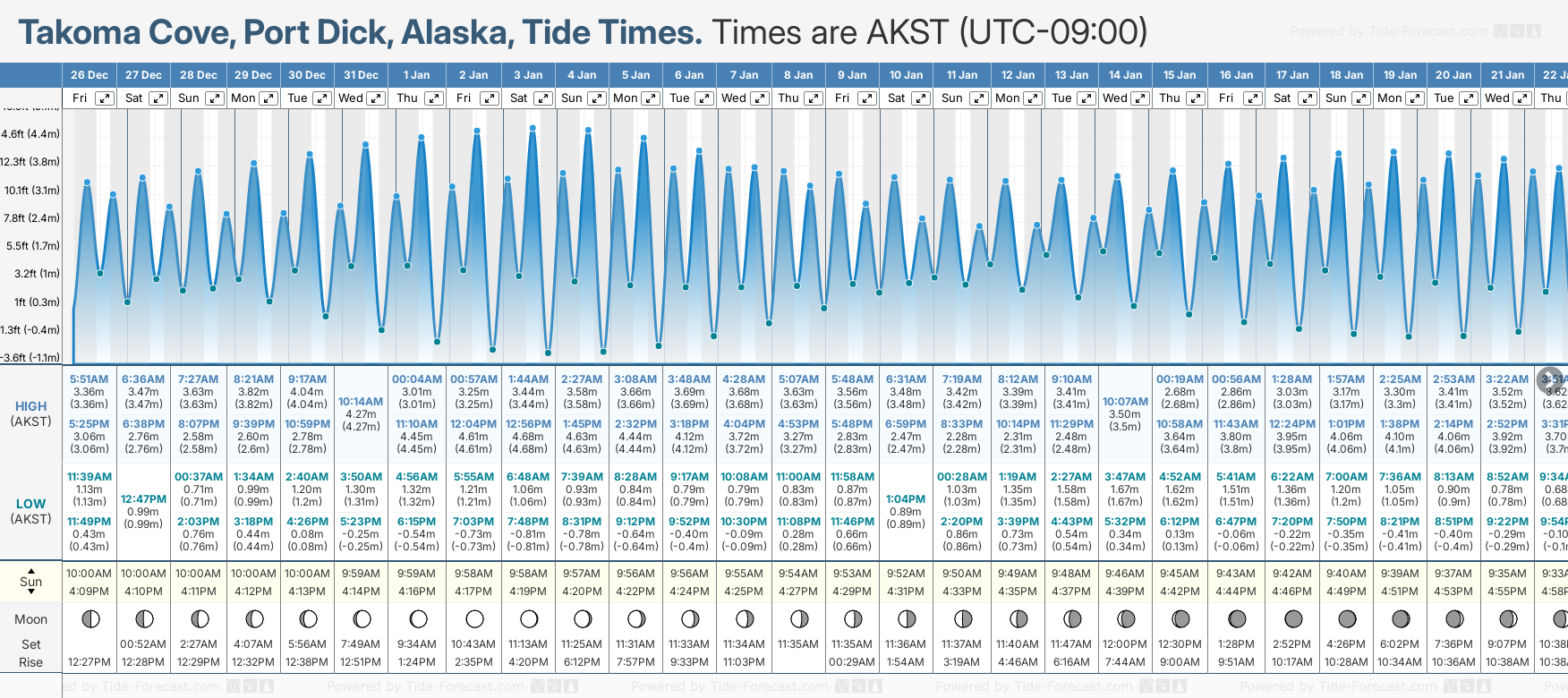 Tide Times are AKST (UTC -9.0hrs). Last Spring High Tide at Takoma Cove, Port Dick was on Sat 20 Dec (height: 4.09m 13.4ft). Next high Spring Tide at Takoma Cove, Port Dick will be on Sat 03 Jan (height: 4.68m 15.4ft).