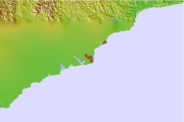 Use this relief map to navigate to tide stations, surf breaks and cities that are in the area of Takoradi, Ghana.