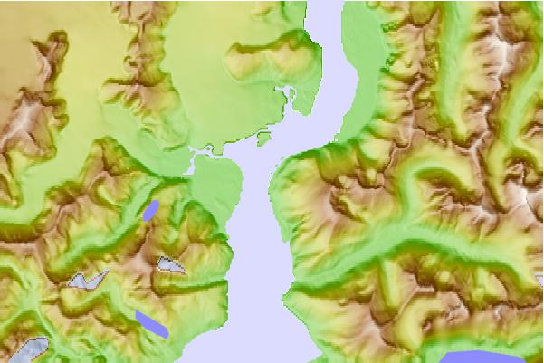 Use this relief map to navigate to tide stations, surf breaks and cities that are in the area of Taku Point, Taku Inlet, Alaska.