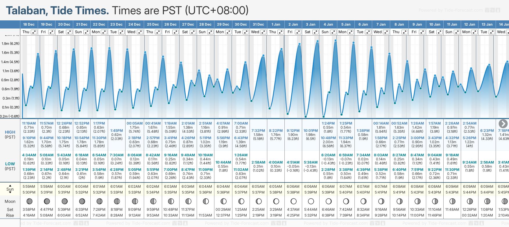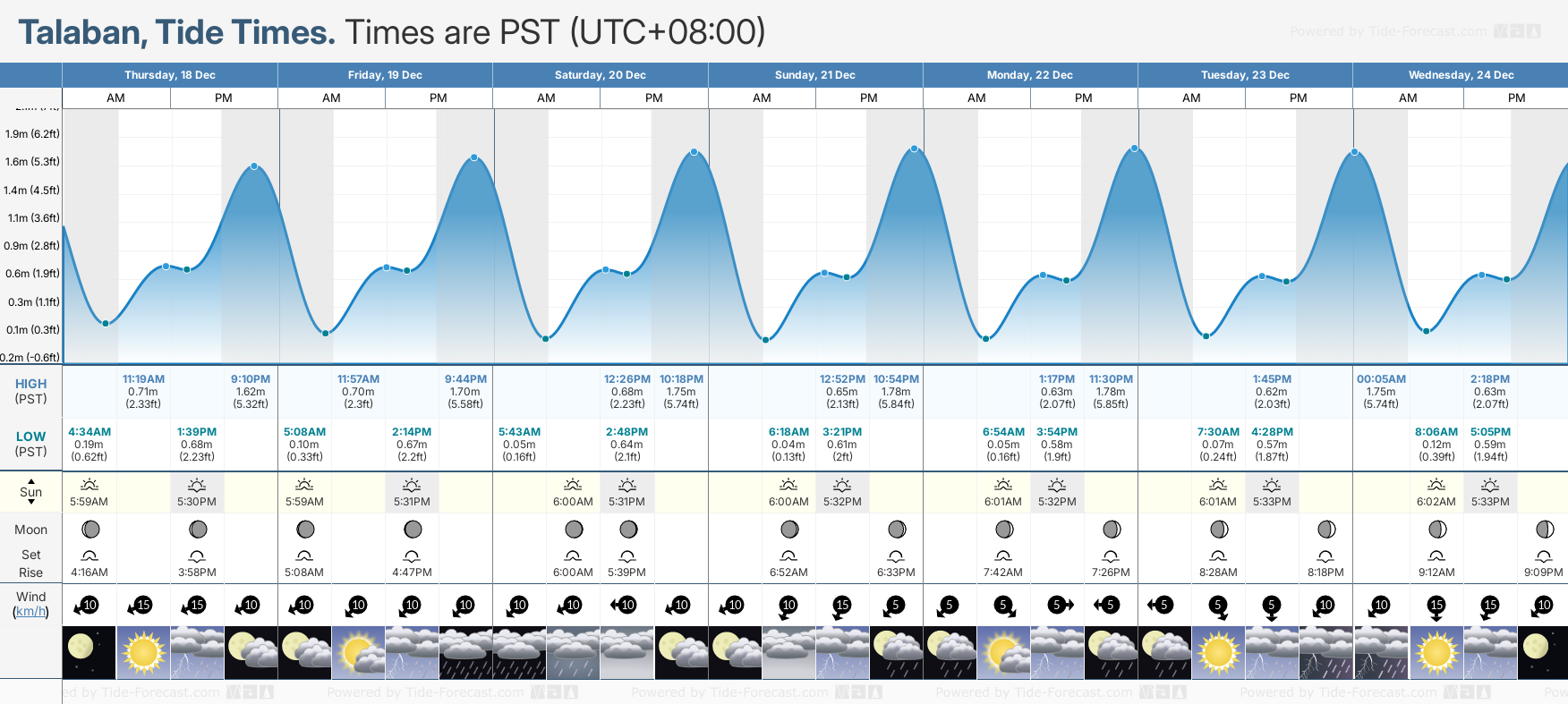 Tide Times are PST (UTC +8.0hrs). Last Spring High Tide at Talaban was on Sun 07 Dec (height: 2.03m 6.7ft). Next high Spring Tide at Talaban will be on Mon 22 Dec (height: 1.78m 5.8ft).
