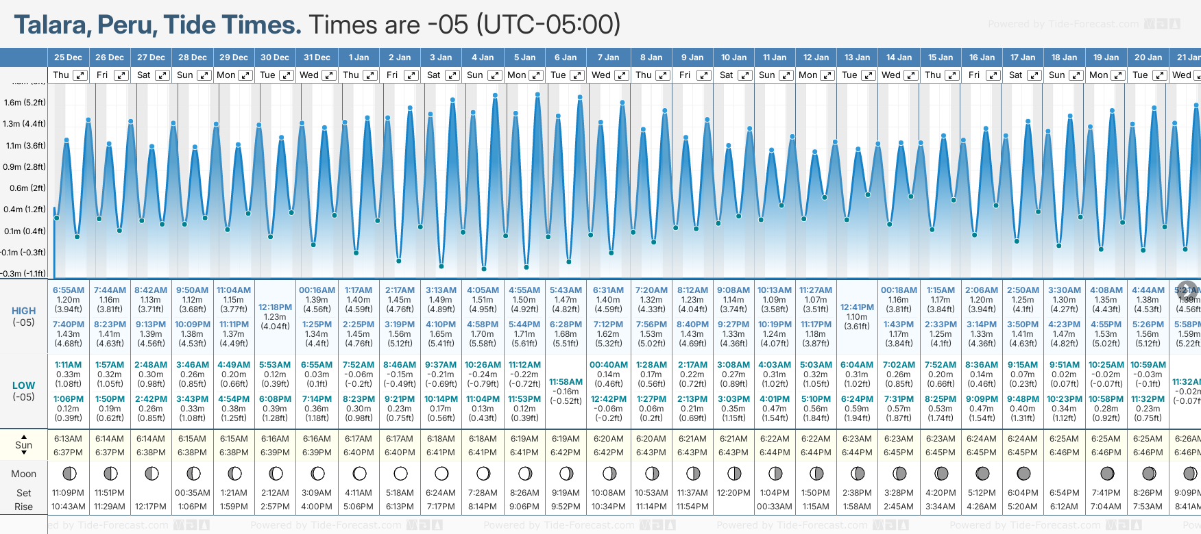 Tide chart for TalaraShowing low and high tide times for the next 30 days at Talara. Tide Times are -05 (UTC -5.0hrs).