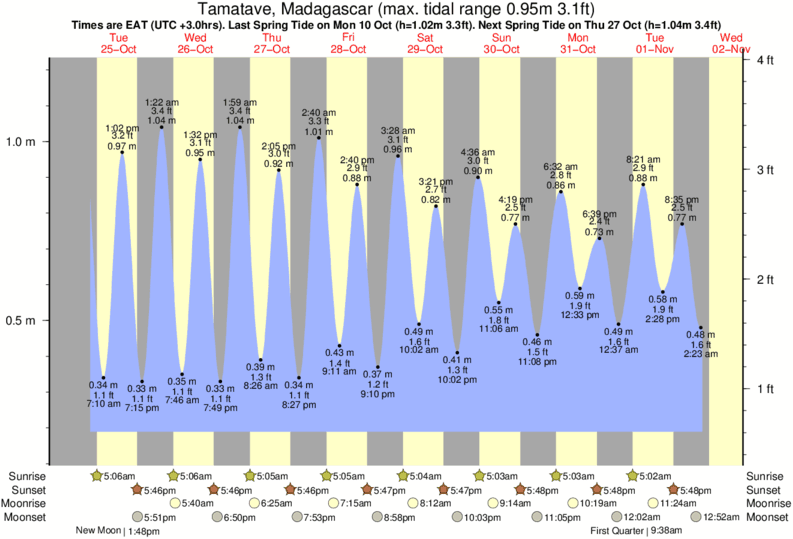 Tide Times are EAT (UTC +3.0hrs). Last Spring High Tide at Tamatave was on Sat 20 Dec (height: 0.98m 3.2ft). Next high Spring Tide at Tamatave will be on Sat 03 Jan (height: 1.12m 3.7ft).