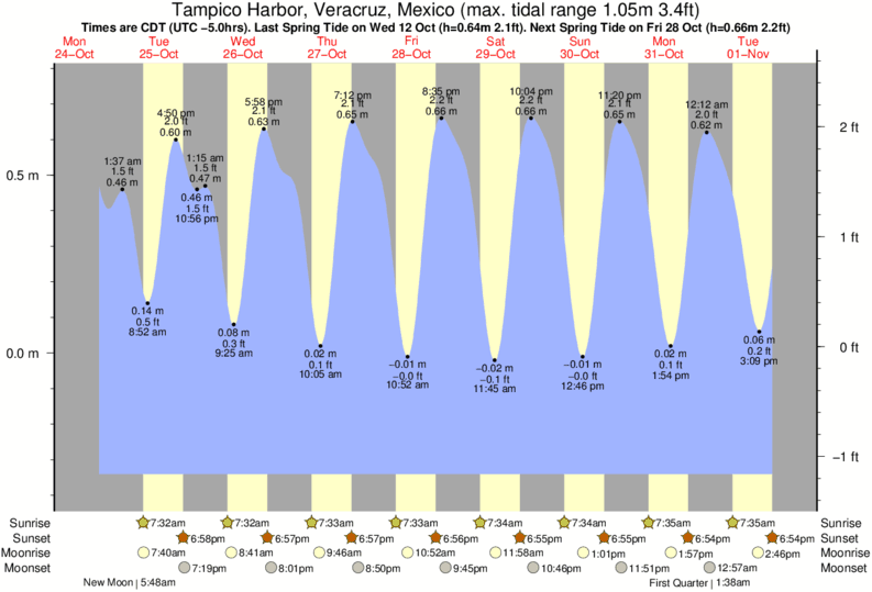 Tampico Harbor tide chart key: The tide chart above shows the height and times of high tide and low tide for Tampico Harbor, Veracruz, Mexico. The grey shading corresponds to nighttime hours between sunset and sunrise at Tampico Harbor.