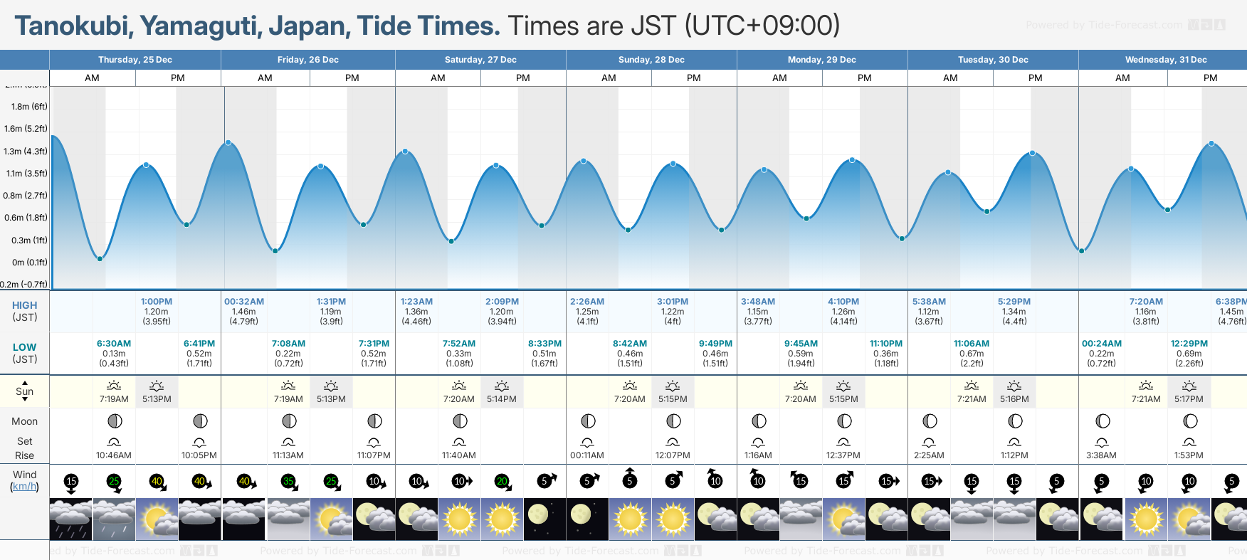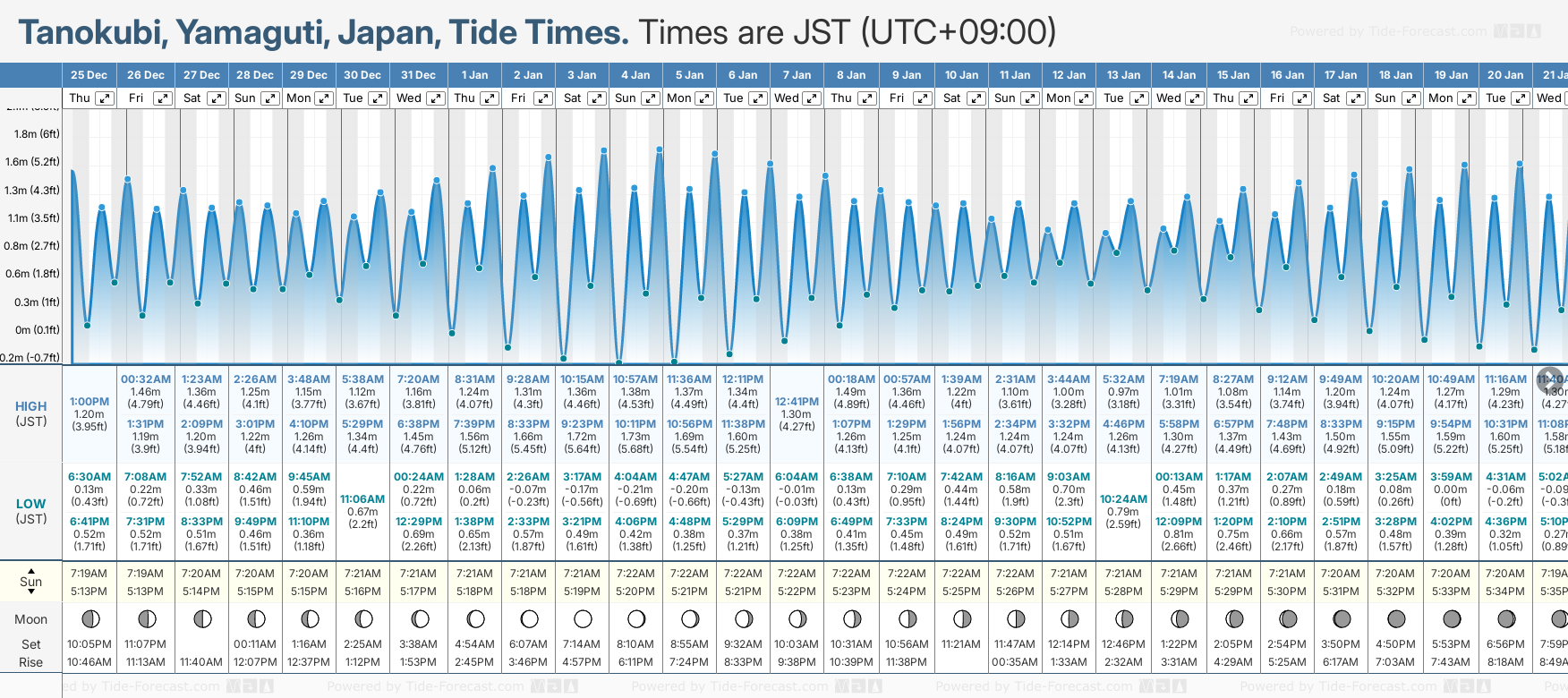 December and January Tide charts for Tanokubi: The tide charts below show the height, time and date of high and low tides for the next 30 days.