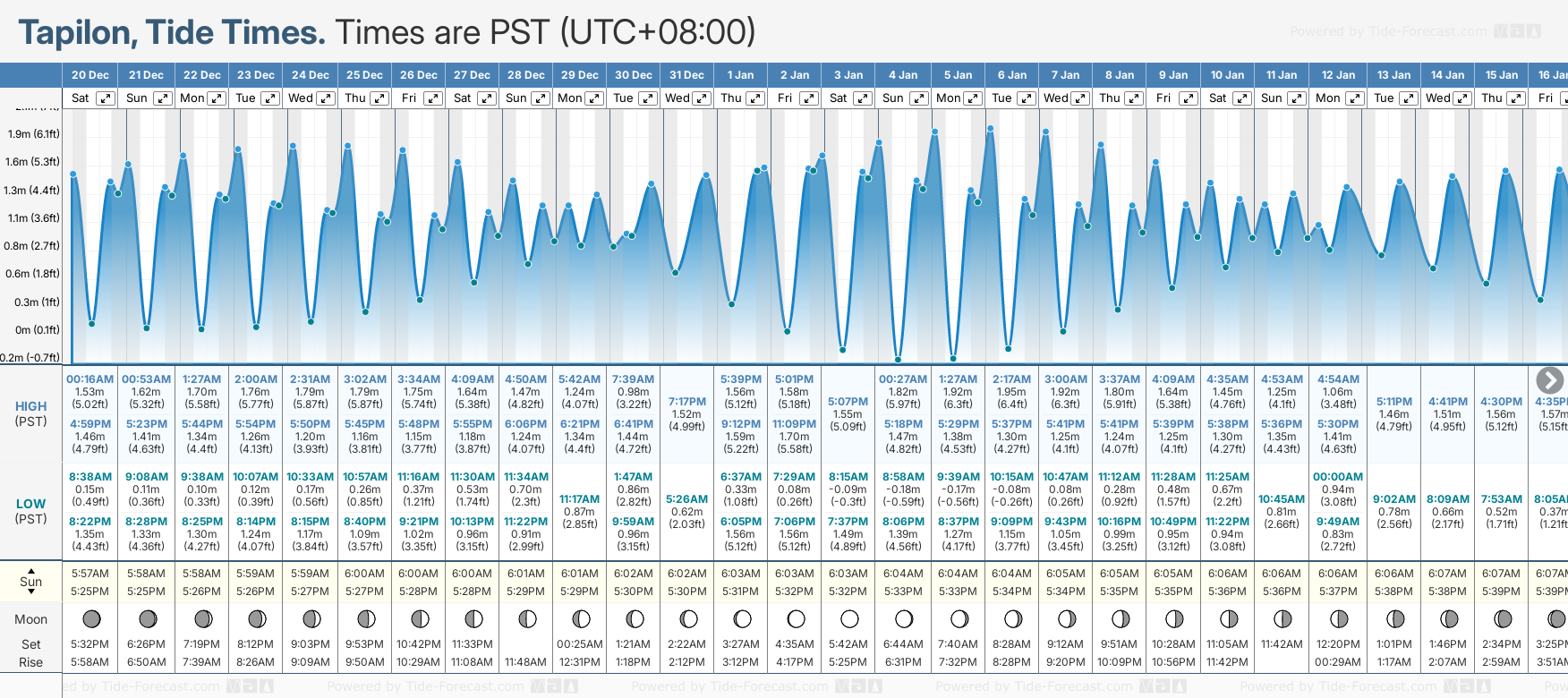 December and January Tide charts for Tapilon: The tide charts below show the height, time and date of high and low tides for the next 30 days.