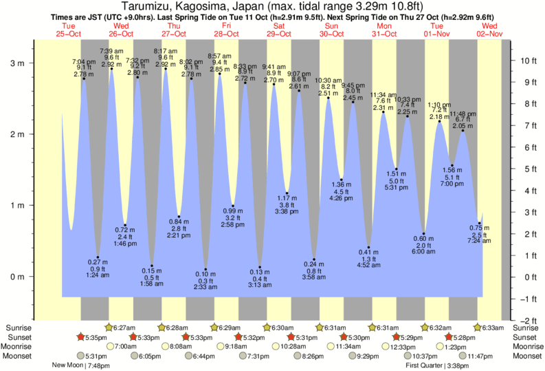 Tide chart for TarumizuShowing low and high tide times for the next 30 days at Tarumizu. Tide Times are JST (UTC +9.0hrs).