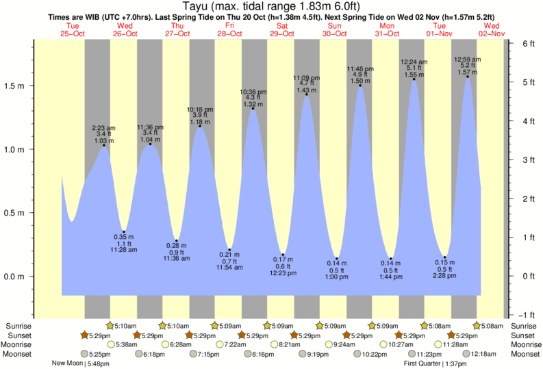 Tide Times are WIB (UTC +7.0hrs). Last Spring High Tide at Tayu was on Tue 09 Dec (height: 1.66m 5.4ft). Next high Spring Tide at Tayu will be on Thu 25 Dec (height: 1.55m 5.1ft).
