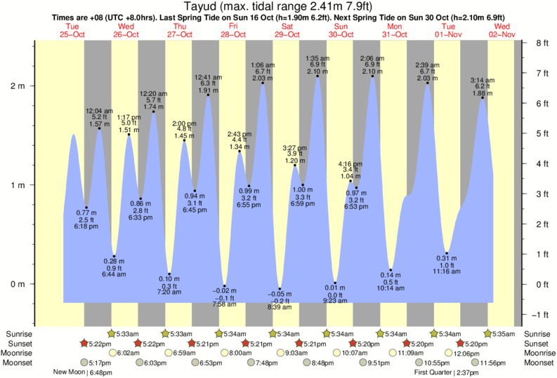 Tide Times are PST (UTC +8.0hrs). Last Spring High Tide at Tayud was on Mon 08 Dec (height: 2.16m 7.1ft). Next high Spring Tide at Tayud will be on Wed 24 Dec (height: 1.92m 6.3ft).