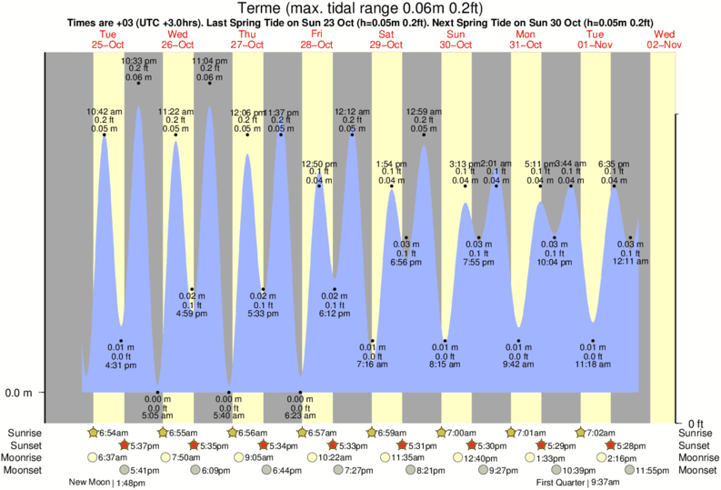 Tide Times are +03 (UTC +3.0hrs). Last Spring High Tide at Terme was on Sun 21 Dec (height: 0.05m 0.2ft). Next high Spring Tide at Terme will be on Sun 28 Dec (height: 0.05m 0.2ft).
