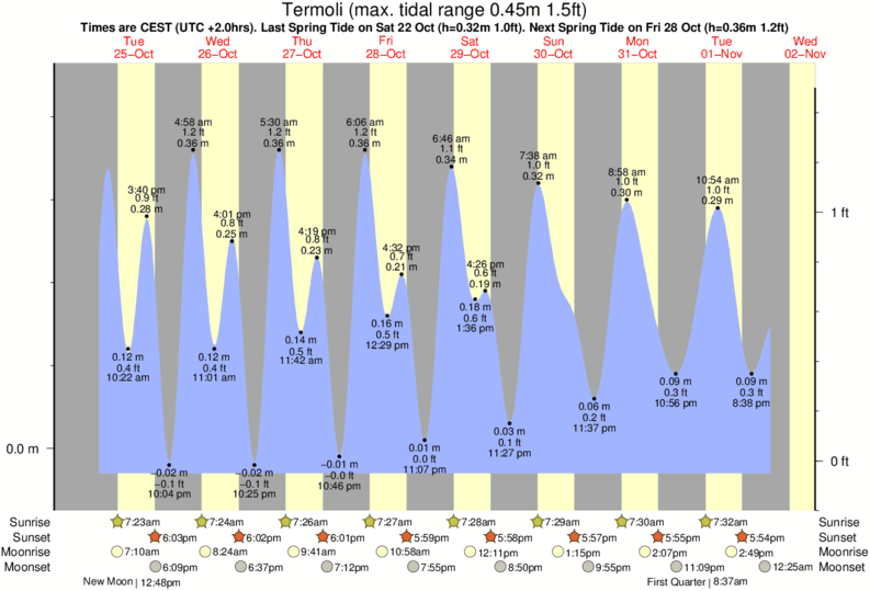 Tide Times are CET (UTC +1.0hrs). Last Spring High Tide at Termoli was on Sat 06 Dec (height: 0.41m 1.3ft). Next high Spring Tide at Termoli will be on Sun 21 Dec (height: 0.38m 1.2ft).