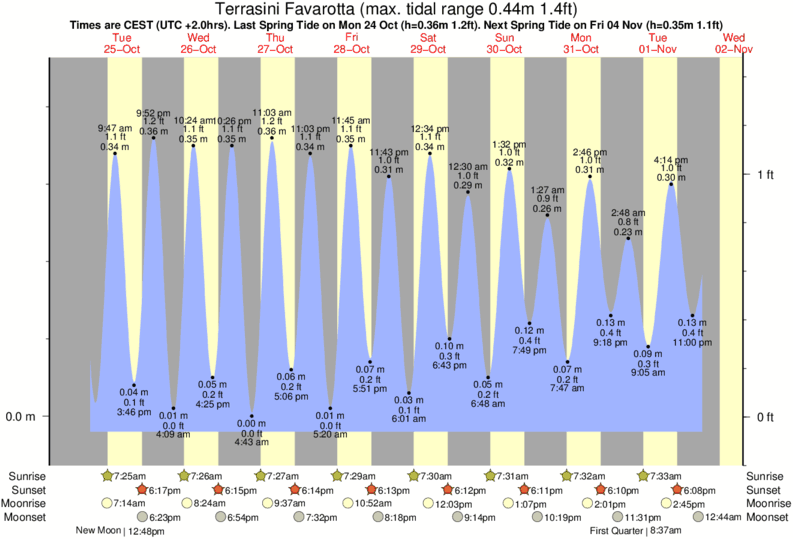 Tide Times are CET (UTC +1.0hrs). Last Spring High Tide at Terrasini Favarotta was on Sat 06 Dec (height: 0.39m 1.3ft). Next high Spring Tide at Terrasini Favarotta will be on Sun 21 Dec (height: 0.34m 1.1ft).