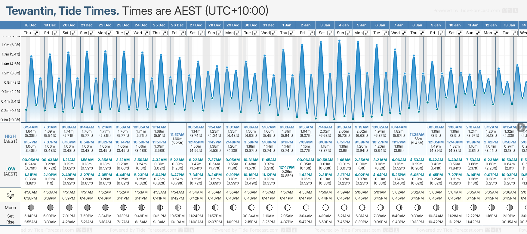 December and January Tide charts for Tewantin: The tide charts below show the height, time and date of high and low tides for the next 30 days.