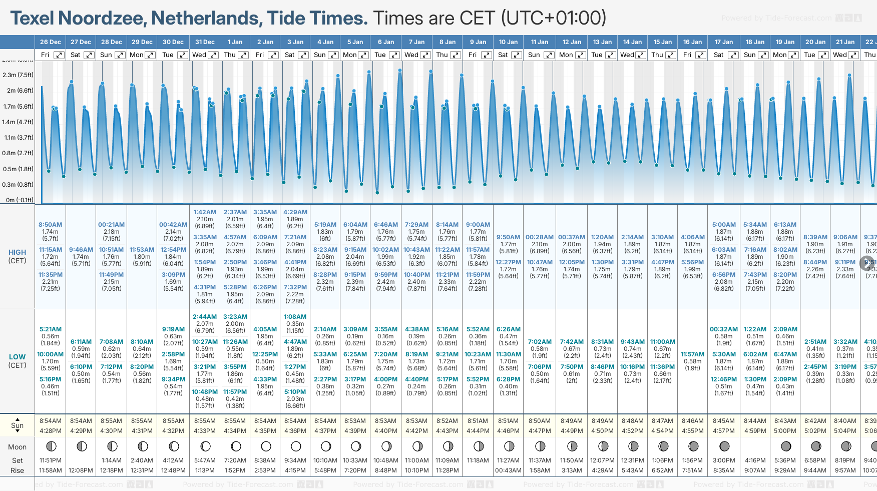 December and January Tide charts for Texel Noordzee: The tide charts below show the height, time and date of high and low tides for the next 30 days.