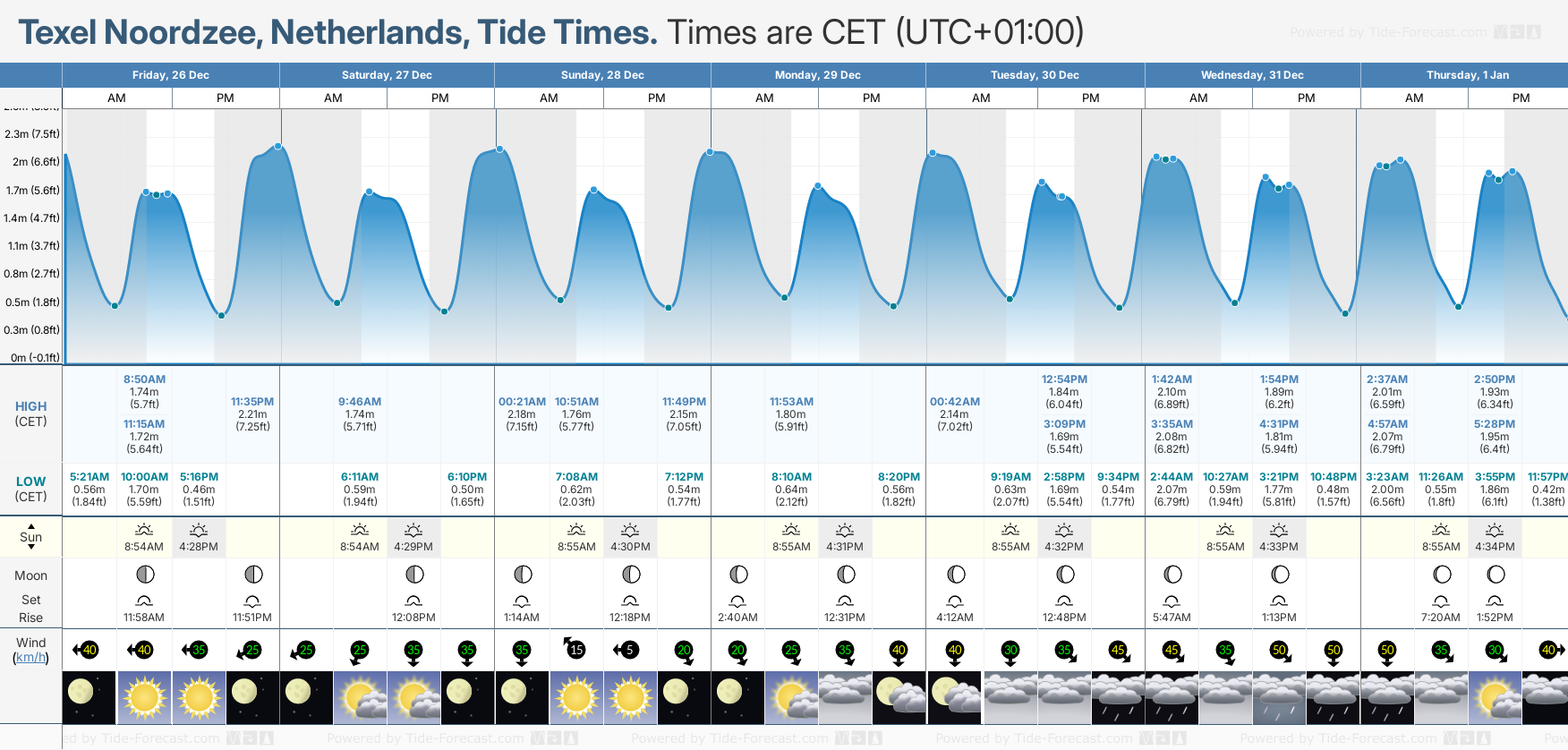Tide Times are CET (UTC +1.0hrs). Last Spring High Tide at Texel Noordzee was on Wed 24 Dec (height: 2.26m 7.4ft). Next high Spring Tide at Texel Noordzee will be on Fri 02 Jan (height: 2.09m 6.9ft).