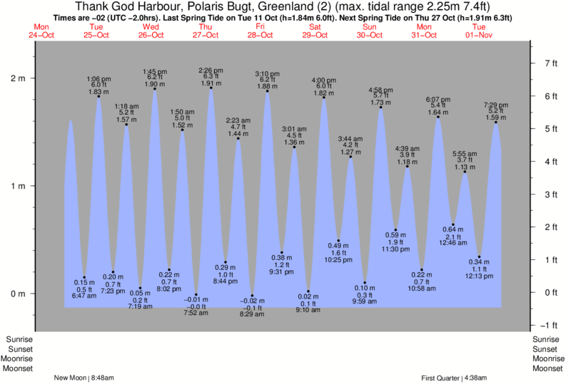 Tide Times are -03 (UTC -3.0hrs). Last Spring High Tide at Thank God Harbour, Polaris Bugt (2) was on Sat 06 Dec (height: 2.12m 7.0ft). Next high Spring Tide at Thank God Harbour, Polaris Bugt (2) will be on Sat 20 Dec (height: 1.86m 6.1ft).