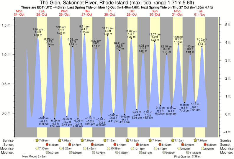 The Glen, Sakonnet River tide chart key: The tide chart above shows the height and times of high tide and low tide for The Glen, Sakonnet River, Rhode Island. The grey shading corresponds to nighttime hours between sunset and sunrise at The Glen, Sakonnet River.