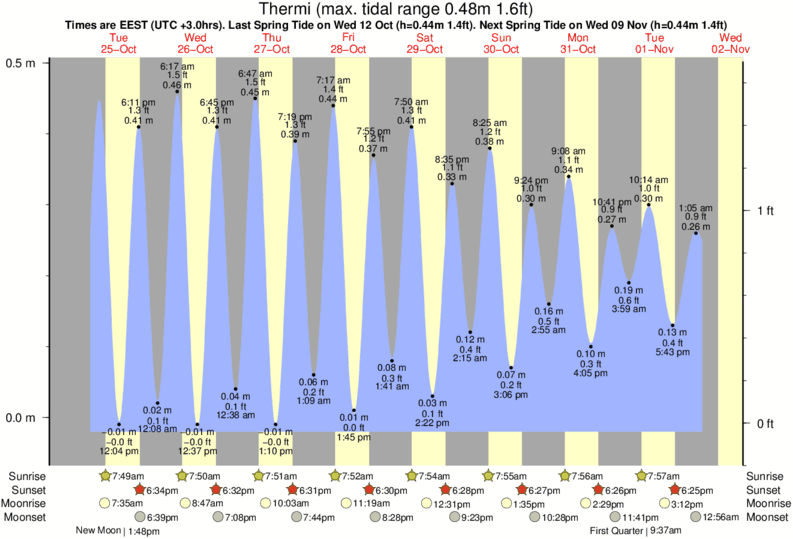Tide Times are EET (UTC +2.0hrs). Last Spring High Tide at Thermi was on Sat 06 Dec (height: 0.43m 1.4ft). Next high Spring Tide at Thermi will be on Mon 22 Dec (height: 0.42m 1.4ft).