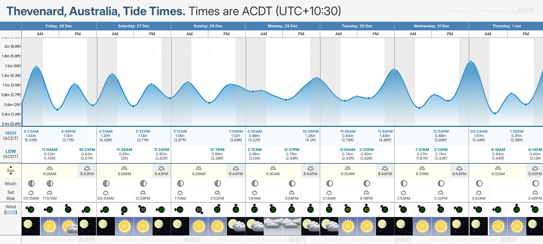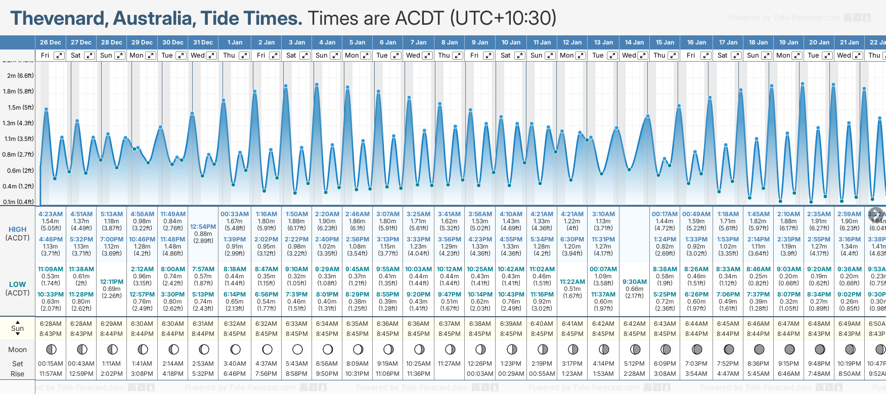 December and January Tide charts for Thevenard: The tide charts below show the height, time and date of high and low tides for the next 30 days.