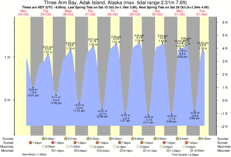Tide Times are HST (UTC -10.0hrs). Last Spring High Tide at Three Arm Bay, Adak Island was on Fri 05 Dec (height: 1.65m 5.4ft). Next high Spring Tide at Three Arm Bay, Adak Island will be on Thu 01 Jan (height: 1.71m 5.6ft).