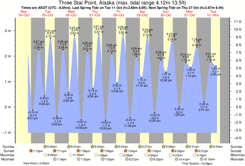 Tide Times are AKST (UTC -9.0hrs). Last Spring High Tide at Three Star Point was on Fri 05 Dec (height: 3.16m 10.4ft). Next high Spring Tide at Three Star Point will be on Sat 20 Dec (height: 2.65m 8.7ft).
