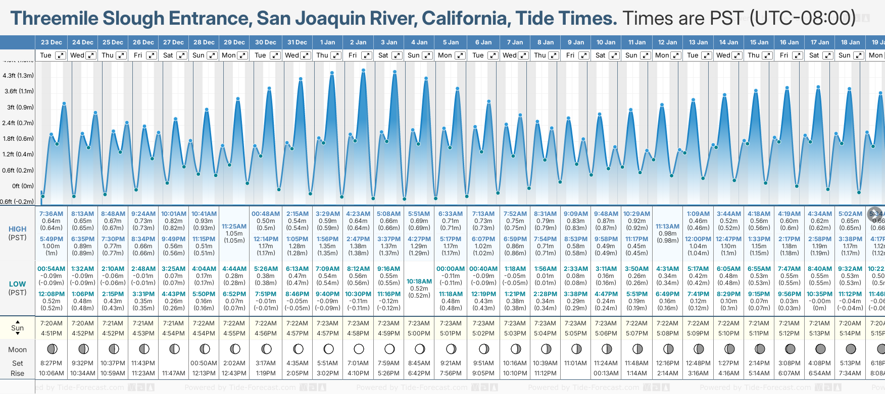 Tide chart for Threemile Slough Entrance, San Joaquin RiverShowing low and high tide times for the next 30 days at Threemile Slough Entrance, San Joaquin River. Tide Times are PST (UTC -8.0hrs).