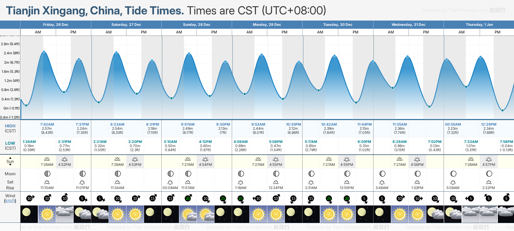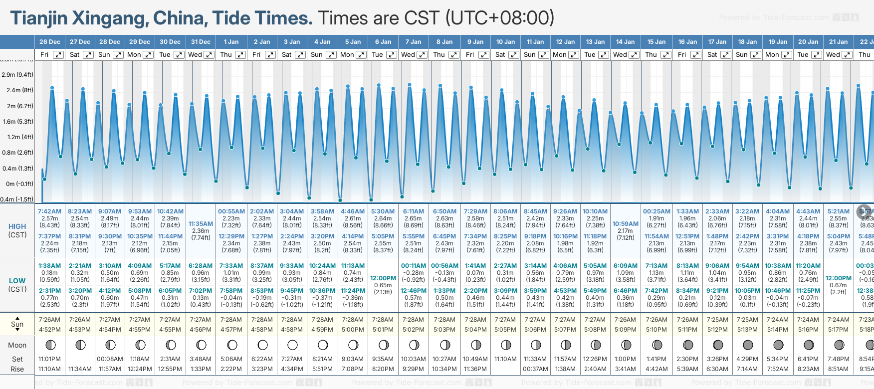 Tide chart for Tianjin XingangShowing low and high tide times for the next 30 days at Tianjin Xingang. Tide Times are CST (UTC +8.0hrs).