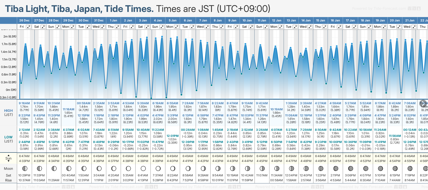 Tide Times are JST (UTC +9.0hrs). Last Spring High Tide at Tiba Light was on Mon 22 Dec (height: 1.92m 6.3ft). Next high Spring Tide at Tiba Light will be on Mon 05 Jan (height: 2.02m 6.6ft).