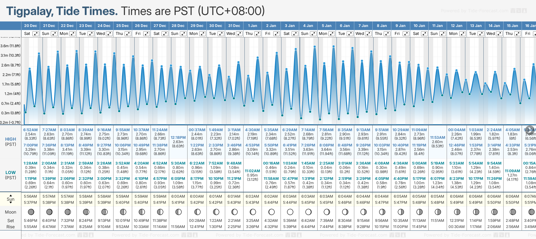 December and January Tide charts for Tigpalay: The tide charts below show the height, time and date of high and low tides for the next 30 days.